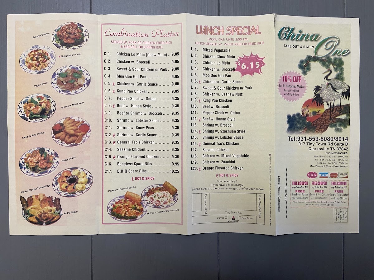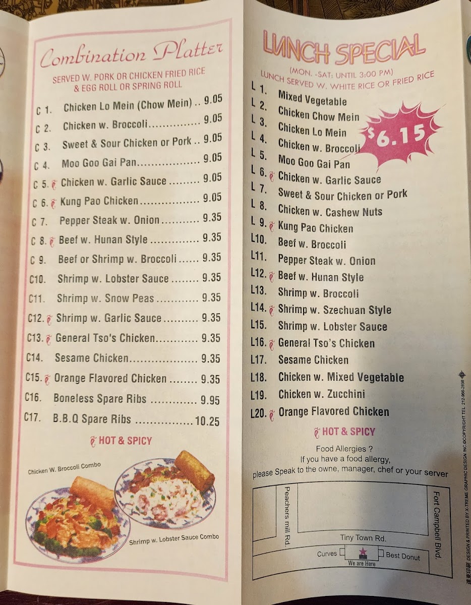 Welcome to China One - Clarksville, a hidden gem located at 917 Tiny Town Rd Suite D, Clarksville, TN. Known for its quick service and mouthwatering dishes, this eatery specializes in a variety of classic Chinese dishes and appetizers. From the crispy Pork Egg Roll to the delightful Crab Rangoon, there's something for everyone. Diners rave about their chicken combinations, particularly the General Tso’s and Sweet and Sour Chicken, ensuring returning customers crave these flavors monthly.